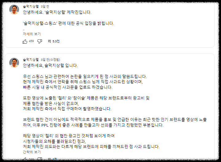 ๊ณต์์ ์ธ ์ ๋จน์์๋ ฌ ์ ํ๋ธ์์ 26์ผ ๊ณต์ ์ ์ฅ์ ๋ฐํ๋๋ฐ์. ์ค์์ค๋๊ณผ ๊ด๋ จํ์ฌ ๋ ผ๋์ด ๋ ์ ์ ๋ํด์ ์ฌ๊ณผ๋ฅผ ํ์ต๋๋ค.